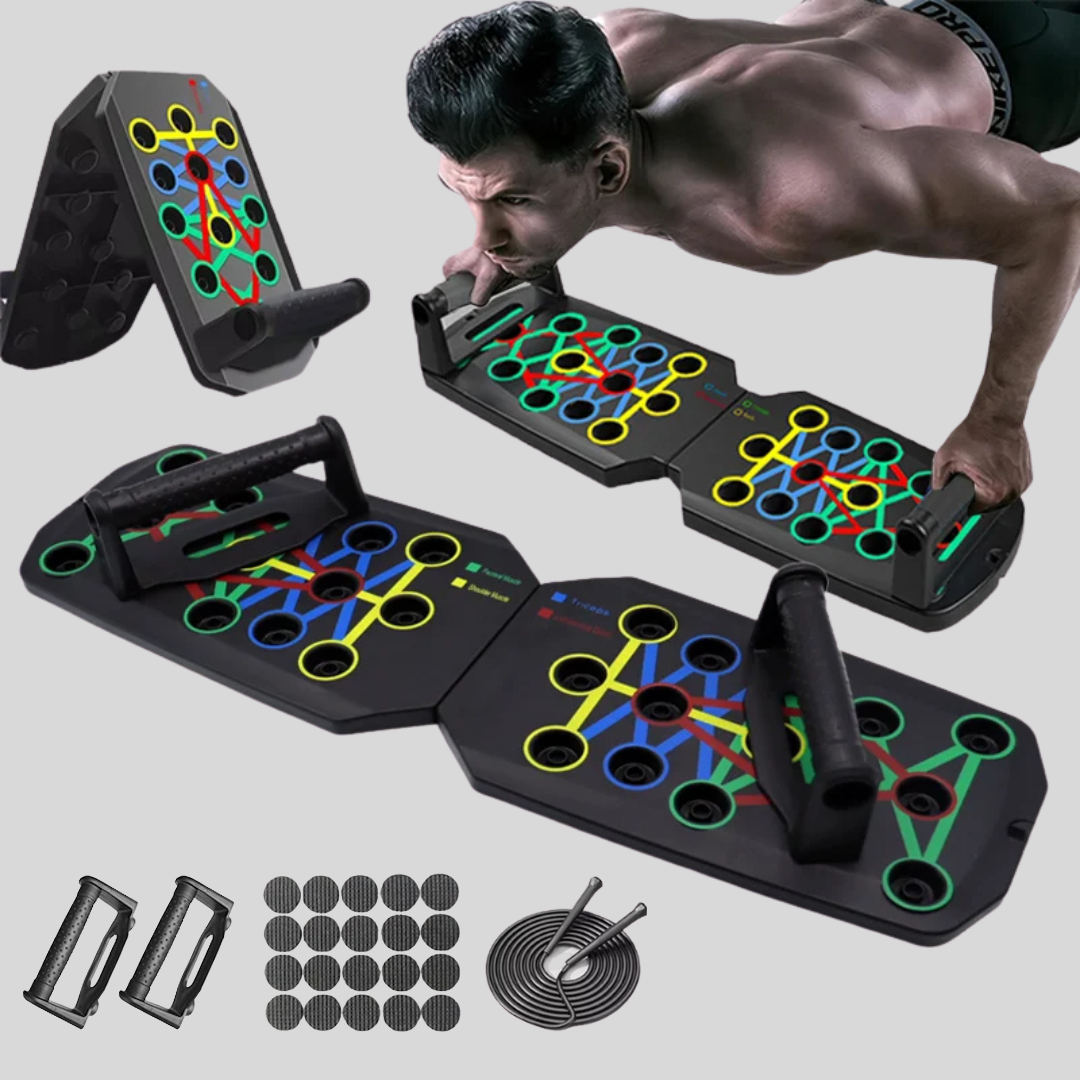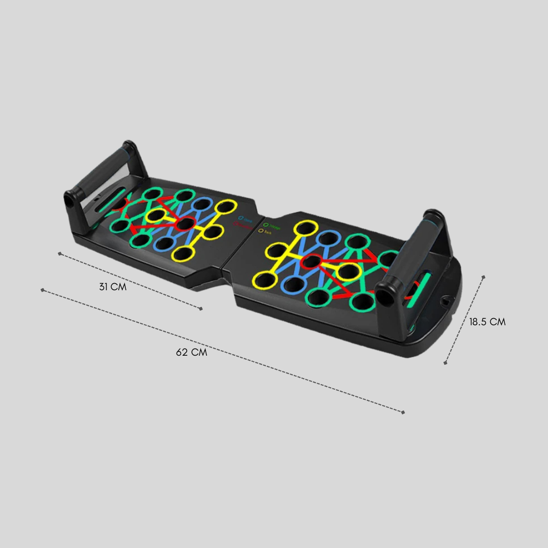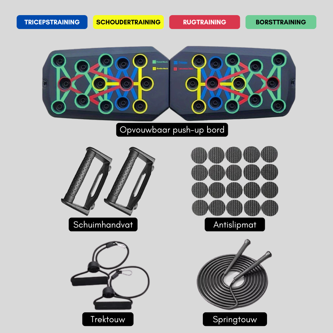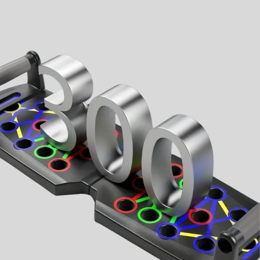Das KrachtVorm Liegestützbrett bietet über 15 Übungsvarianten mit farbcodierten Positionen zur gezielten Stärkung von Oberkörper und Rumpf. Durch das faltbare Design ist es perfekt für Zuhause, das Fitnessstudio oder unterwegs.