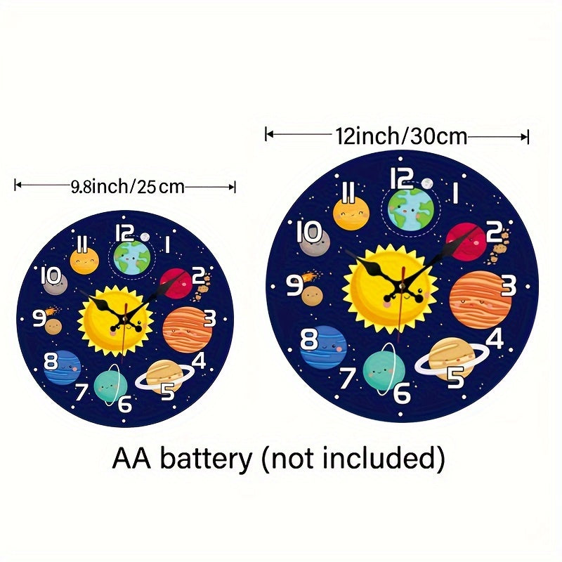 Die CosmicTime Solarsystem Uhr verleiht jedem Raum einen Hauch von Weltraumzauber. Mit einem farbenfrohen Solarsystem-Design ist diese runde Wanduhr ideal für Wohnzimmer, Schlafzimmer oder Büro. Der geräuschlose Betrieb macht sie sowohl praktisch als auch dekorativ, sodass sie Zeitmessung und Kunst vereint.