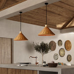 Diese rustikale Pendelleuchte aus geflochtenem Rohr bringt Gemütlichkeit in Ihre Küche oder Ihr Wohnzimmer. Das handgefertigte Design aus Naturmaterialien schafft eine warme und einladende Atmosphäre.